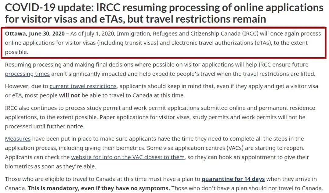 尽管加拿大旅行限制仍然适用,但加拿大移民,难民和公民身份(IRCC)恢复处理旅游签证可能是一个重要的转折点。